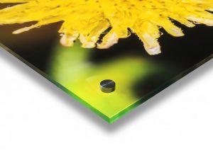We can provide the standoff hanging solution with our 1/4″ and 1/2″ thick acrylic. This option excludes the dibond backer since it’s not as necessary. The standoff bolts in each corner help keep the print from bowing. Our floating/hidden option requires a dibond backer to provide that rigidity along with a place to adhere our floating and hanging hardware.
