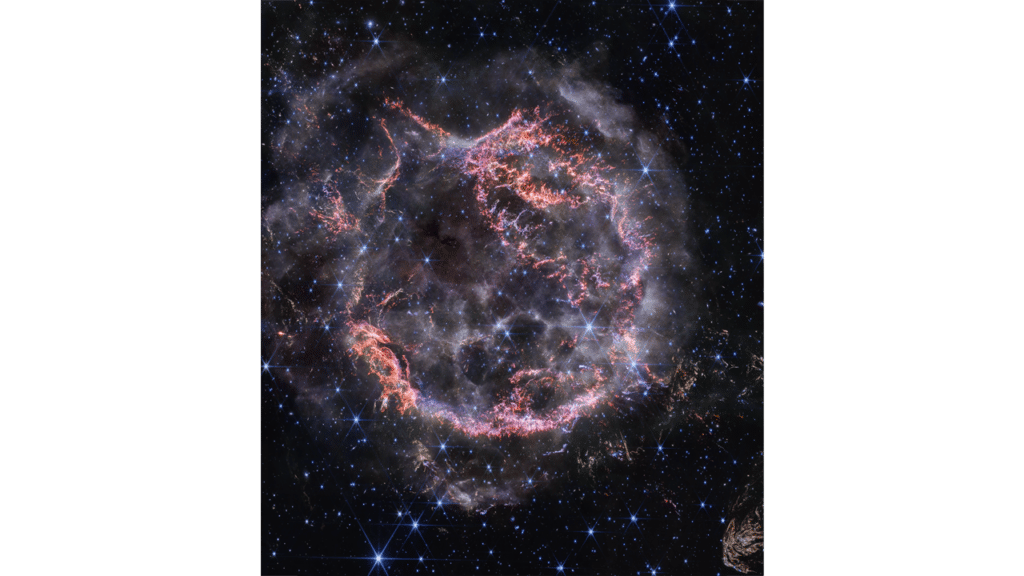 Cassiopeia A Release Date: Dec 13th, 2023Intricate details of supernova remnant Cassiopeia A (Cas A), with the expanding shell of material slamming into the gas shed by the star before it exploded. The most noticeable colors in Webb’s newest image are clumps of bright orange and light pink that make up the inner shell of the supernova remnant. These tiny knots of gas, comprised of sulfur, oxygen, argon, and neon from the star itself, are only detectable by NIRCam’s exquisite resolution, and give researchers a hint at how the dying star shattered like glass when it exploded. Max print size after enhancements: 48×55″ |