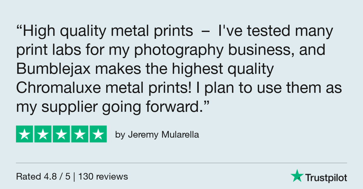 Bumblejax Metal Prints have arrived and you can expect the same commitment to quality that we have with all of our products. We've spent months researching the best equipment and materials along with testing and tweaking our color profiling. We use the industry leading Chromaluxe panels for superior longevity and color vibrancy along with the top dye sublimation printer and inks. Every metal print comes ready to hang with a full aluminum sub-frame and french cleat hang system.  Let's just say we're thrilled with the results and we think you'll be too!